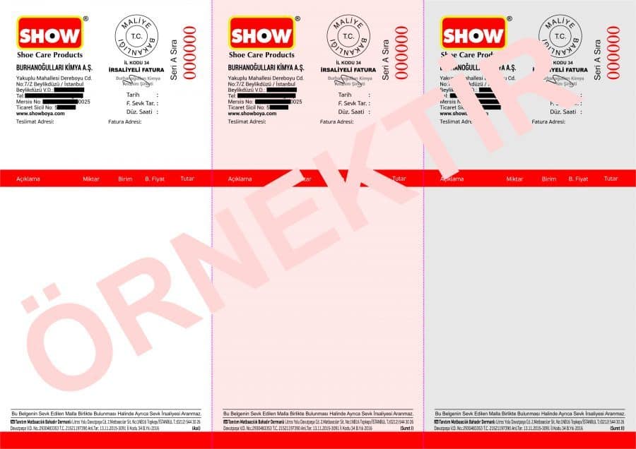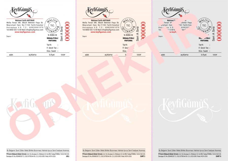 E-Ticaret firmalarında kullanılan fatura türü olan ve a4’te 2,3 veya 4 nüsha olarak bulunan fatura türleri resmi bir evraktır. Bu evraklar sadece maliye bakanlığı tarafından yetkilendirilmiş anlaşmalı matbaa firmaları tarafından basılabilmektedir.