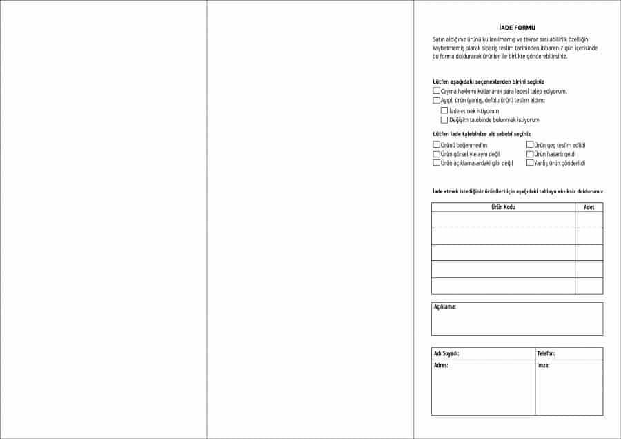 E-Ticaret firmaları için iade formu kullanımları yeni yasalar gereğince zorunlu hale getirilmiştir. Bu formları isteğe bağlı olarak faturanın arka tarafına basım yapmak sureti ile eklemek mümkündür. Gerekli bilgiler faturanın arka tarafına basılarak herhangi bir iade durumunda fatura ve iade formunun tek belge halinde ürünle birlikte size ulaşması yeterli olmaktadır. Bu durum hem evrak azlığı hemde iş kolaylığını beraberinde getirmektedir.